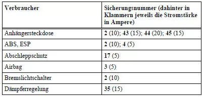 Die Tabelle zeigt die Sicherungsplätze für die wichtigsten Verbraucher. Die rechte Spalte enthält den Steckplatz, dahinter in Klammern die Stromstärke der Sicherung in Ampere.